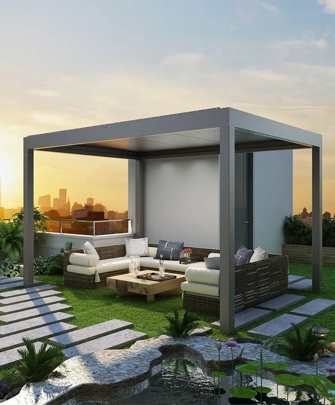 Imagine waking up, grabbing your coffee, and stepping into your aluminum louvered pavilion. With a press of the remote, you tilt the louvers to 45°—enough to let soft morning sunlight filter through, but not too much to glare on your book. The dark gray aluminum frame complements the dewy grass and blooming flowers, creating a serene start to your day. Unlike fixed-roof pavilions that trap heat or open patios that leave you exposed, the adjustable louvers let you “dial in” the perfect light. And since it’s aluminum, you don’t have to worry about morning dew making the frame damp or rusty.